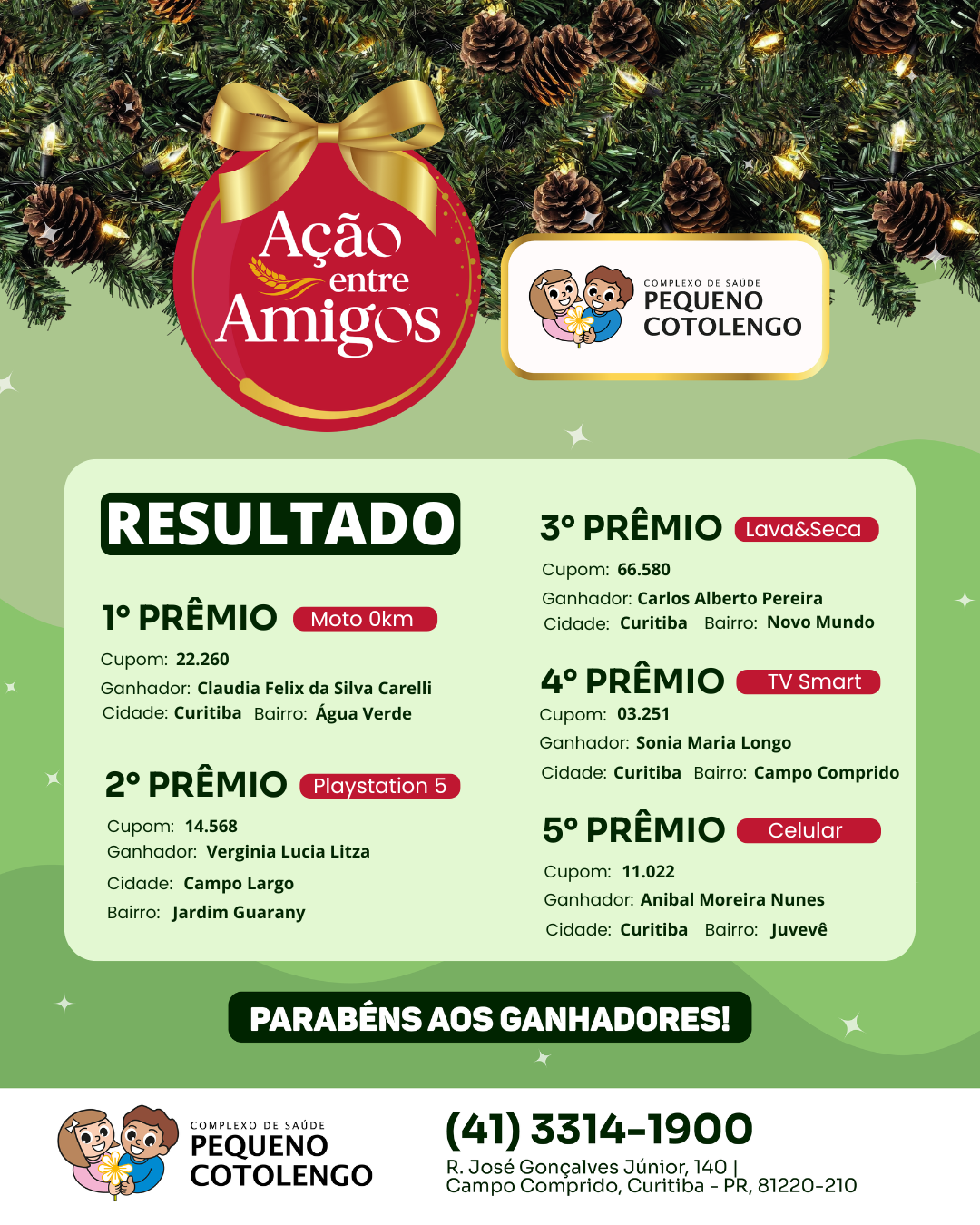 5. O ganhador autoriza a utilização do nome e imagem, sem quaisquer ônus, para os organizadores ou para o Complexo de Saúde Pequeno Cotolengo do Paraná.